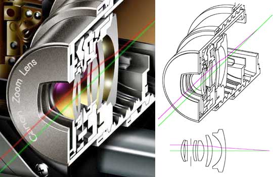 右側の線画は2次元CAD、着彩画はPhotoshopで制作しています。光軸上にある緑色の光線と、それと平行に多少離れた赤色の光線が交差する位置があります。交差した位置は結像面と呼ばれ、この位置にフィルム面があります。