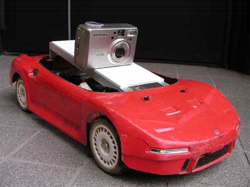 度重なるクラッシュでキズだらけの初代電動ラジコンカーのルーフを切断し、オンボードカメラ装着マシンとして蘇らせました。映像にボディの一部を映し込ませるため、あえてこの傾斜角と高さを確保しています。