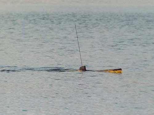 潜舵を+5度くらいに制御して浮上したRC潜水艦、潜舵をさらにアップすれば停止します。 喫水下が黄色いのは、水中でも目立つ色として採用しただけではなく、ビートルズのヒット曲「Yellow Submarine」の影響がありました。しかし艦全体を黄色にするのはやはり抵抗があり、結果このような塗装となりました。